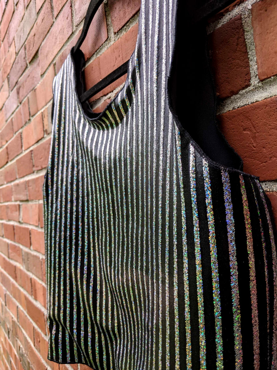 - Razzle Dazzle - alternating 1/4 inch vertical stripes of dotted metallic black and dotted holographic metallic silver, on black.